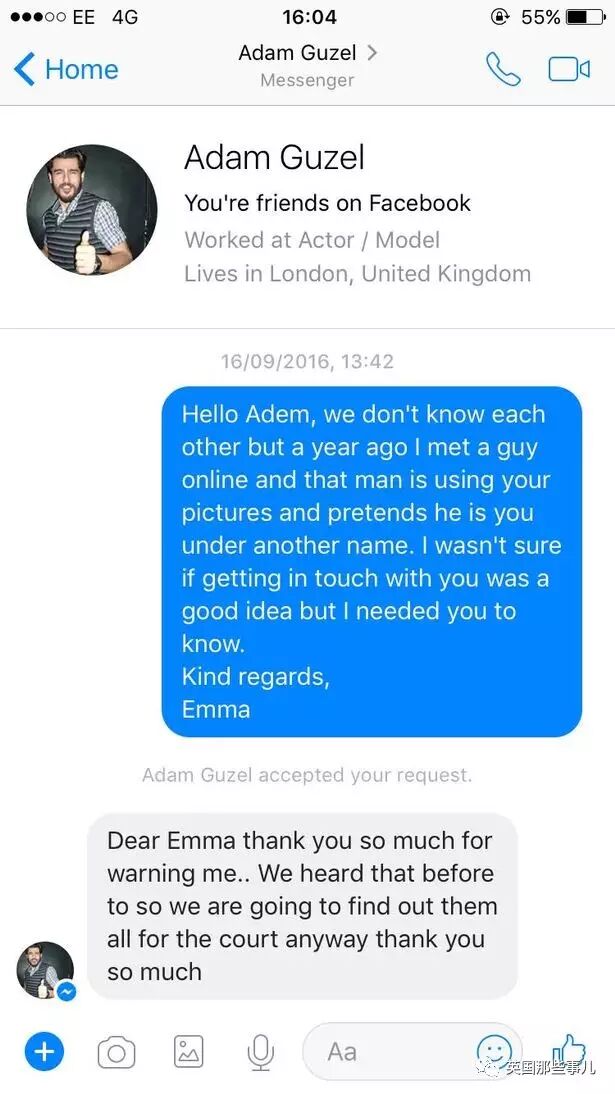 “你好,Adam,我们互相不认识彼此,不过一年前我在网上遇到一个男人,他用你的照片假装是你,我不确定该不该联系你,但是我想,你应该知道这个事情。