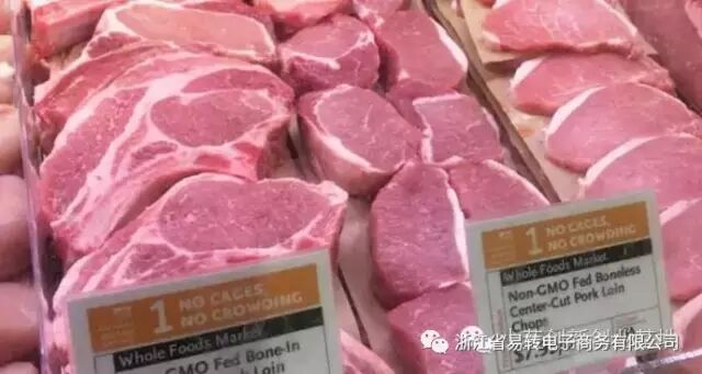 比如每款肉排的标识上写着:NO CAGES(没有笼子) ,NO CROWDING(没有拥挤),Non-GMO fed(非转基因),数字“1”是全食对该产品做的评级。意思是:这只猪是在没有笼子,没有拥挤的环境下生长的,并且是非转基因食品,全食对它的评级为“1”。